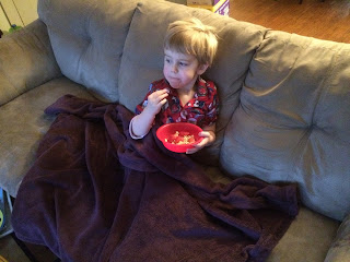 He usually has "donut cereal" (Froot Loops) for breakfast with grapes, but Hubster threw the rest of the grapes out last night, declaring them too "squishy." I think about peeling a Cutie but settle for slicing some strawberries leftover from our ladies' Advent tea at church yesterday morning. On the weekends we let him eat on the couch and watch cartoons as long as he doesn't have milk in his bowl. When I hand him his breakfast, he says, "Ooh, strawberries!"